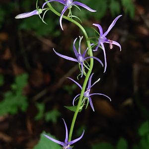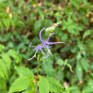 シデシャジン(四手沙参) 初めましてのお花です😀 紫色の細い花弁があっちゃこっちゃいってました😅 あと柱頭が1本すらーっとしてます。 キキョウの仲間らしいです。 全体的にか細~い感じカワイイです☺️