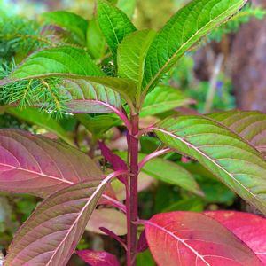 午後の庭から🍡 【下から順に紅葉✨】 紫陽花さんも紅葉してる〜😃 ちょうどピンク色の鶏頭さんの茎と重なって伸びてる〜😊