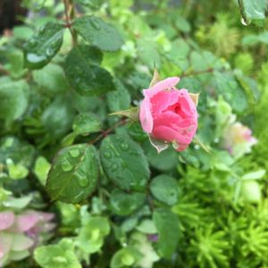 おはようございます。ミニバラが蕾を沢山つけてくれています。雨の雫で綺麗です