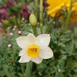 ☆寄せ植え🌼2年位ほりあげて置いてあった水仙の球根🌿花を付けて伸びてきました。😋** *多分ラッパ水仙と思いますが🎶 * 寄せ植えの横から見た👀📷✨です🌼🌿