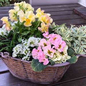 💚寄せ植え💚 ハンギンクバスケットを壊した残りのパンジー💛と寄せ植えを植え替えた残りのプリムラ💗 斑入りシレネとアリッサムはハンギンクバスケットを作った時の残りです。 中にムスカリが植えてありますのでここにブルー💙が咲いたら素敵だな〜😊 四葉のクローバー🖤も添えてみました。 ワイヤーのバスケットにヤシマットを入れて使いました。