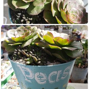 鉢減らしミッション遂行中〜❣️ ぽんたちゃんにもらった猫プリントの缶に植えました😊 木箱に植えてあったアエオニウムいろいろを引っ越して、さらにリメ缶やプラ鉢から苗を足して詰め込みました〜!(・∀︎・)ノ 紅葉してきたスヨンといっしょに!スヨンもぽんたちゃんからもらったもの😃 鉢減らしの終わりがまだまだ見えない💦 後ろから… ・真黒法師×2・アパレ・レモネード・キウイ・チョコチップ・月下美人錦・群月花×2・ブルーエルフ×2・クラシマハタ・姫明鏡×2・ケーペンシス ルビー・デービット・子持ち蓮華🌱🌱🌱