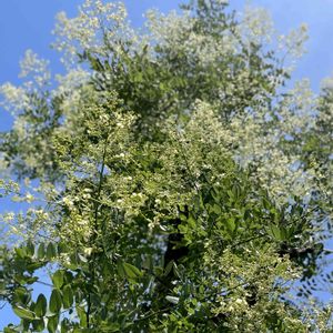 7月24日 散歩道🚶♀️🚶♀️ 街路樹 「エンジュ」(槐) 近隣センター散歩道に2本 咲き始めたが、低い枝は少ない。クマバチが飛び回るので木の下は花びらが落下している ✳︎名前が分からなかったがやっとわかった。 ✳︎マメ科 エンジュ属 →葉っぱは、奇数葉状複葉 ●「シダレエンジュ」という種類もあるそうです。