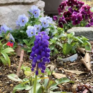 植えっぱなしのムスカリ と、種が飛んで増えたスミレ 午後から急に曇って強風と雨です☔️