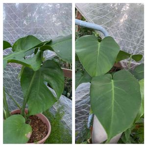 今日のお花 モンステラ おはようございます☀ 今朝は涼しく朝は秋なのに 今日も昼間は残暑厳しい💦 左側花友さんから頂いたモンス元気です🍀 右側冬に溶けてしまい植え替え やっと葉がでもモンス特有の 葉の切り込みはまだ出ず💦