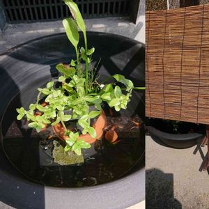 メダカ 🎈 お外管理にしてみます。睡蓮鉢にビオトープの植物入れて5匹になってた元のメダカさんと昨日JA 産直で買ってきた10匹を一緒にしました。😆😆 日差しが昼から強くなりスダレを掛けて対応💦 ビオトープ専用の植物はやはり傷まない。値段だけのことはあるな😅🌿 って感心してます。