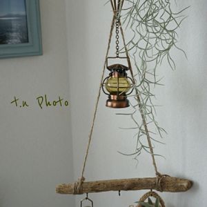 3/30投稿の🌊拾った流木 あとひとつは ダイソーの麻紐とアンティークねじフックを付けて 飾ってみました。 リサイクルショップで見つけたミニランプも出番です😄