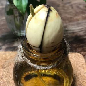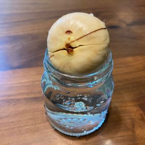 8/10 33℃ 種を水につけてから18日目 発根確認? 細いもやし状の根が種の割れ目から伸びている 水耕栽培では水換え時に根を折ってしまいそうなので鉢植えにした 管理も屋外の日陰にする 真夏の暑さが本番を迎えようとしているが発芽まで頑張ってくれるだろうか