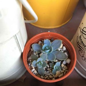 蒸れ瀕死からの生き残り子持ち蓮華。 1号ポットに住み替えて様子見。1番上の子はシワシワが治らない。残りの2つは見た目元気だけど成長してないみたい。