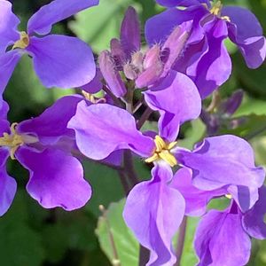 【ムラサキハナナ(紫花菜・花大根・オオアラセイトウ)】 中国原産、アブラナ科一年草 分枝して伸びた茎の先に総状花序を出し、アブラナ科らしい十字形の紫の花(花径2~3㎝程度)を春から初夏にかけて多数咲かせます。 花色:紫 草丈:40㎝~60㎝ 花期:3月~5月 北九州市立白野江植物公園にて