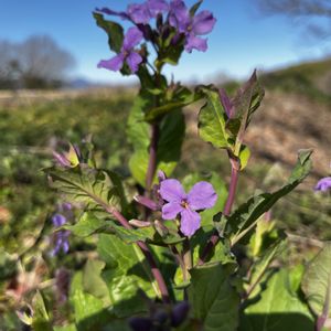 『ショカツサイ』ムラサキハナナ 🏷️今日のお花 義母はこの花を見ると👀 「ハナダイコン🌸の花が咲いたなぁ〜😄」と言う。 義父の墓参り、雑草に混じって咲く花だ。草むしりついでに、むしろうとしたら🥹、 「あたしはね、この花が好き💜なんよ。じ〜さんの墓🪦に、毎年この時季にちゃ〜んと咲いてくれるダイコンの花がね☺️好きなんよ😍。」 若くして、先立たれた夫の墓に🪦咲く、薄紫色した雑草(私にはそう見えてた。)義母にとっては、在りし日の夫を思いだす大切な花だった。 そんな義母も、病に倒れ呆気なく若い夫の元🪦へ。 しばらくして、弟夫婦に、墓守りを託し今度は、私の両親の面倒を看るため、実家のあるここへ家を構えた。 また、会いに来ましたよ。 墓🪦の周りは綺麗に片され、雑草一つ、生えなくなっていたけれど🥹 今年は区画から外れた雑地に🤩 ハナダイコンの花が咲いてた🥰 GSを知らなければ☝️ 今日の今日までこの花は、私の中でハナダイコン🤣🤣🤣。 大根の花は白いけど、ムラサキハナナは、その名の通り💜色🤗。 菜の花にもよく似た紫の花🤨。 ならば🤔 大根に菜の花🧐 もしや食べれるのか🤩 🔍花が咲く前の柔らかい若芽をお浸しに☝️。菜の花と同じように食べられます😋。時季が過ぎると固く苦く、口に出来ません😆💦 ⚠️ 食べられる種類は、 「オオムラサキハナナ」です。 やっぱり食べれるって(๑˃̵ᴗ˂̵)✌️。 3月初めの日。 春だよ〜🌸🌸🌸🌸🌸。