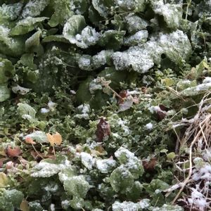 おはようございます。 昨夜短時間だけど降った雪は、 今季一番の寒さをもたらした🥶 今朝の最低気温−6.1℃ 薄っすら雪なのに9時になっても 溶けない⛄️ 零れ種からのハナダイコンの葉は 砂糖をまぶしたお菓子の様。