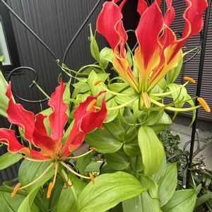 グロリオサ🌿 初めて育ててみました😊 花が終わりかけると 立ち上がっていた花びらが真っ赤になりながら下がってきます。 支柱が必要ですが 葉先がくるっと回るので 誘引クリップは 必要なくて フェンスに引っ掛ければ止まってくれました🌿 先日 欲しかったトゥーインワンの球根が植え付け時期を逃してて 半額で売っていたので 一緒に植えたら 直ぐに発芽🌟 今 40cmぐらいに伸びて来てます😊 咲いてくれると良いな💓