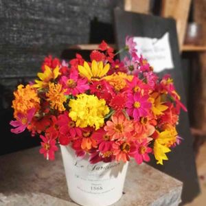 切り花🌸室内。納屋で撮った時暗かったので今日取り直し📷 夕暮れ時にコスモスを切ったとき薄紅色かと思ってました。 納屋も電球の明かりで薄暗く昨日撮ったあと、明るいリビングへ持っていったら全然色が違ってました😱 庭に咲いてたジニアやミニひまわり、マリーゴールドダリア、コスモス、キャンディーポップなどです。裏も同じように。裏はそろそろくたびれたミニバラがあります🌹