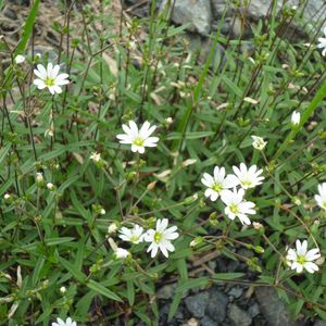 クモマミミナグサ(雲間耳菜草) ナデシコ科 花弁は10枚のようですが5枚です。 砂礫地や岩場に生える多年草 北アルプスにしか咲かない固有種