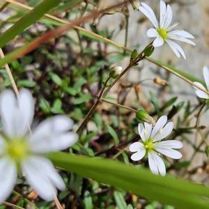 クモマミミナグサ(雲間耳菜草 ) ホソバツメクサ(細葉爪草) ナデシコ科 とてもよく似た2つのお花 クモマミミナグサ 花弁は2つに切れ込み小さな小さなハート🤍5弁ですが一見10弁に見えます👀 北アルプスの北部に限って分布する日本固有種 🇯🇵⛰ 高山の礫地に生えます🗯 ホソバツメクサ(細葉爪草) 別名 コバノツメクサ お花はクモマミミナグサよりひとまわり小型で 5弁の花びらの先端は切れ込まずに尖りまるで地に咲く輝く星のような印象を受けます⭐️ ホソバツメクサの名のとおり葉は細くて糸の様です🧵 こちらも日本固有種🇯🇵 高山の蛇紋岩地帯でよく見かけます🪨