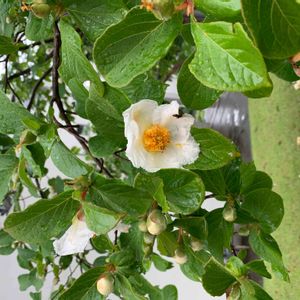 夏椿です。もうすぐ30年に なるかもしれない木です。 蕾が沢山付いて ポタポタ落ち るので、朝昼晩三度拾って います。😞ふぅ〜。