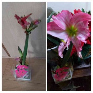 コンパクトアマリリス 桃色 メイクアップアマリリスや、マジックアマリリスの名前でクリスマス頃〜お正月に良く売られている。 土も水も無くてもお花が咲くからこのまま売られて、芽が出たら見切り品に。 そりゃ球根に栄養貯めてるから咲くだろうけど、本来の開花時期じゃないし、使い捨てなら土も水も要らないだろうけど…ちゃんと花後に植えてあげたら来年以降も咲くのにな〜🤔 見切り品の中から時間をかけて選んだ桃色💞イメージ写真よりも繊細な感じで大好きなお花が咲きました✨✨😍✨✨