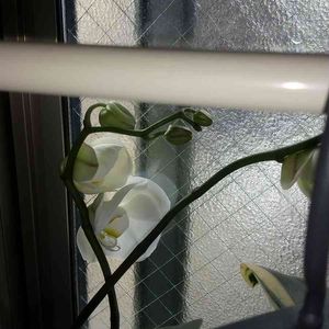 2019年10月3株入りで陶器鉢ごと「不燃ごみ」だった胡蝶蘭。咲きました💞 真っ白✨キラキラ✨ 真っ白、初で嬉しい😄