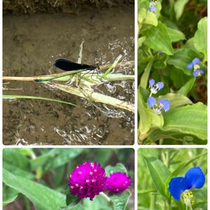 今朝の散歩でハグロトンボと遭遇👀✨ 雑草の中で鮮やかなツユクサも🟦✨ ついでに… 右上 マルバツユクサ…二段咲だらけ 8/24撮影 左下 センニチコウ 8/25撮影