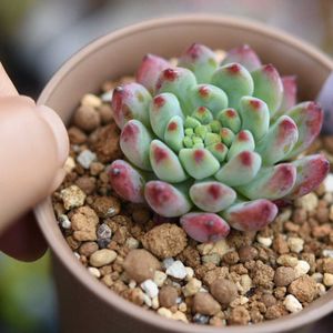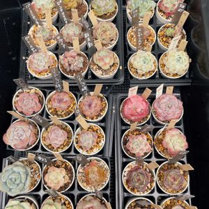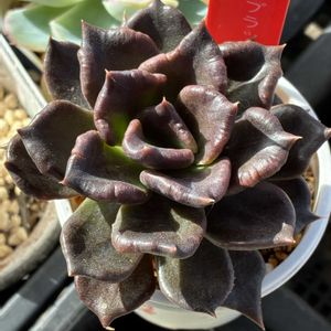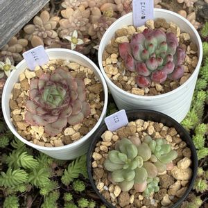 黒っぽい自作のネームタグにしたので目立たなくなった⭐️ 茶色の札は、土の実験中なので、土の番号を書いています。 エケベリア系は、白い鉢で揃えたいので今日は植え替え🌱 ちなみにこれは、小さい子達なので1寸鉢サイズなので小さくて可愛い♡︎(°´ ˘ `°)/ 雨が当たらないよーにしてるけど、もうジュレってきそうな子がいる、、泣