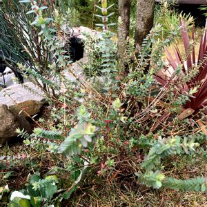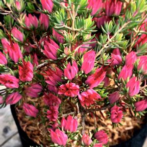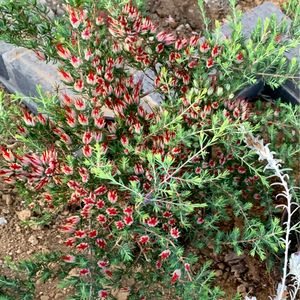 低木珍しい初めてのお花 松のような葉の木 どんなお花が咲くのか楽しみでした😆真っ赤お花! 松の葉の固まりのような赤い花 今は小さいので寄せ植えのグランドカバーにしています😁