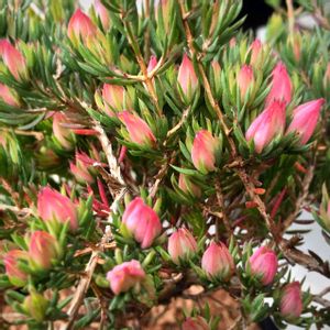 今日HCで初めて見ました松の様な葉 先端部がコロンとしている🤔これがお花😨 ピンクのお花になるようです😄 フトモモ科 耐寒性常綠小低木 30-50㎝這い性