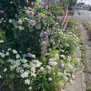 朝、先日君子蘭いただいたお宅から、この前ギボウシ可愛いって言ってたから引っこ抜いて持って行きなって言われ、頑張って掘っていただいて来ました🥰なかなか抜けなくて傷んでしまった(╥ω╥`) 大輪のブルームーンが咲きました🥰 株もデカくなんで家の東側はバラづくしです🌹🥰 今日のピエールさん、美しい😍 クレマチスは半開き〜笑