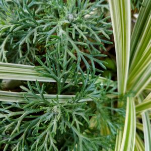 3年目ローダンセマム 蕾が小さく見える👀のと、大きくなったミスカンタス?キャンタス? シマシマのリボンを掛けたよう 緑🟩色のグラデーション