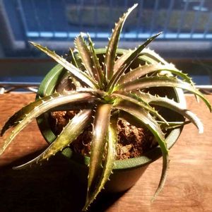 年末にお迎えした我が家初のディッキアさん。 中央部分が赤みがかってて、 色味がやっぱり好き。 この子は植物育成LEDの真下の特等席に。 萎れてる下葉は元に戻らなそうなので、 成長点からの新葉に期待。 海に生きるヒトデとかクラゲみたいに見えてきた。 私のなかでは、すっかり丘ヒトデ。 ○ディッキア交配種 南アメリカ原産のパイナップル科・ディッキア属の植物。細かいトゲのある鋭い葉っぱを放射状に生やす。強い日差しを好む。3℃以上で管理する。春~秋は外でも可。乾燥を好むので土が本当にしっかり乾いたら葉に水がかからないように水やり。