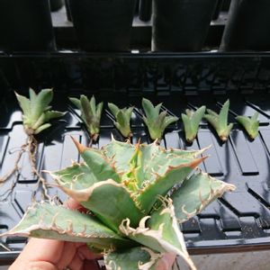 Agave titanota Reo 今日は朝から心を鬼にしてカキ仔外しに勤しみました。🙍💦 結局、7つ外して、小さい2つは付けたままで戻したので9つカキ仔が付いていました。🤔 親株もカキ仔もちゃんと育ってくれるかちょっと心配です。