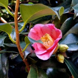 ツバキ科 ツバキ属 日本 原産 常緑小高木 照葉樹の代表 カメリア ジャポニカ 原種の流れを色濃く 残しているように 思われます。 通勤途中の川沿いに 咲いていました。 こちらでは 同科のサザンカが 2~3分といったところ かなり早い品種 なのでしょうか。 ツバキらしい 硬い常緑の照葉が 日差しを受けて つやつやと… 早春に咲くイメージ ですが これからの 季節を彩る花です。 花弁の縁が うっすらと紫が 差しています。 なかなか洒落てますね。 取り急ぎ 今季初めて見た 椿の花をご紹介しました。 今日1日 お疲れ様でした。