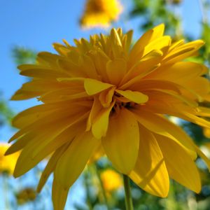 8/7㈰② 🏷日曜ビタミンカラー♪ 💛八重咲き大反魂草💛 ヤエザキオオハンゴンソウ 💛花笠菊 💛ハナガサギク 初めて出会いました😃 花は菊で葉は菊の葉より大きくて、草丈が2m近くありました!! キク科オオハンゴンソウ属の多年草で3m近くなるそうです。 7cm大の筒状花は舌状花になります。 葉は深く3裂します。