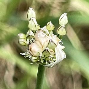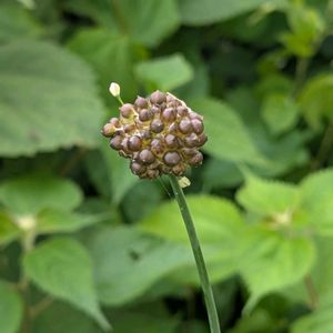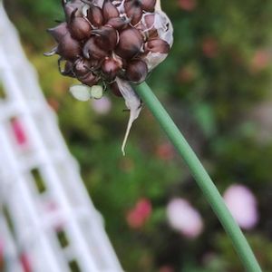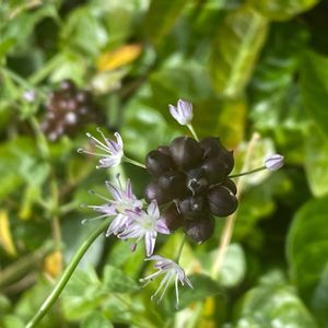 茶褐色のムカゴ(珠芽と)と淡紅紫色を帯びた白い小花 ノビル 25/05/19 病院の植え込みにて 今までにもムカゴはであっていたが、花は初めてのような🎶 ネット上では、雄蕊が6個、子房は3室となっているが、撮りきれていなかった (病院の出入り口付近,腰を屈めて撮影する間も怪訝そうな目で立ち止まれるかたもあり💦)