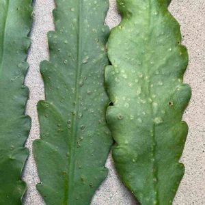 クジャクサボテン「みなとまつり」💕 来年、咲きそうな大きな葉の開花予定の鉢を含めて4鉢。 大きい葉も新葉も、全部がみんな、こんな葉っぱに😣 ブツブツ、ボコボコでクレーター模様みたい。 全ての葉っぱがこんな葉っぱに…。 これ、ウイルス病なのでしょうか? 酷い葉っぱには、真っ黒い点も! どなたか、同じ経験をお持ちの方は いらっしゃいませんか? 今日、泣く泣く、4鉢を廃棄しました😭