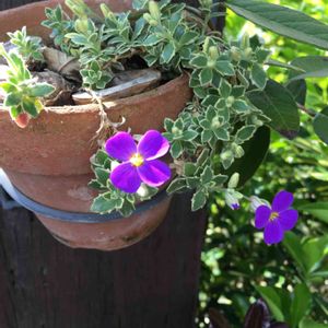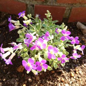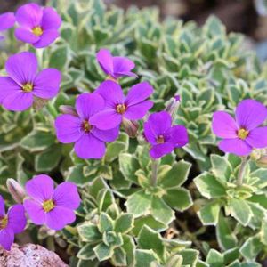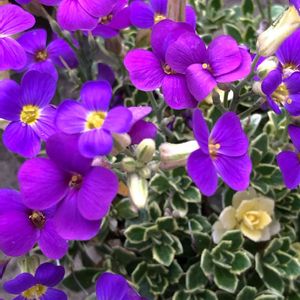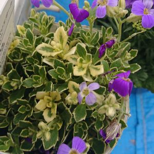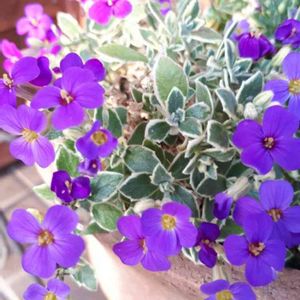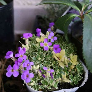 お気に入りの花❣️ オーブリエチア💙💜と オーブリエチア バリエガータ ラピス(斑入葉) 下左は昨年、結いのはなさんで見つけたものが年越しで元気に咲きました。 下右と上は今年HCでみつけましたが植え替えが遅かったので😅😆