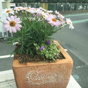 初めての寄せ植え。ただ鉢に詰めただけ←ポット3つくらいが良かったのかも。夜は寒いから避難させてと店員さんに教えて頂いた♪
