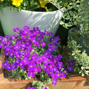 こんにちは😃 本日、快晴です☀️ 寄せ植えの鉢を整理したいと思って新しくお花を迎えてもイメージがまとまらず、結局単植えになり鉢ばかりが増えてしまうという…💦 picはオーブリエチア バリエガータ ラピス 斑入りの葉っぱと紫色の小花が可愛らしい でも高温多湿に弱いらしい:;(∩´﹏`∩);: