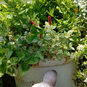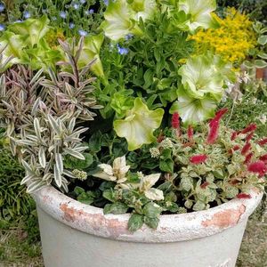 寄せ植え 白の斑入りの葉ポリゴナム ティホン 冬 雪で溶けてしまってがっかしてたら 園芸店で 発見‼️即お迎えしましたよ~😆 うちにある斑入りちゃんを集めて寄せ植えにしました💕 ペチュニア 純翠 キャットテール バリエガータ タイム プレジオイデスフォックスリー ヘーベ など