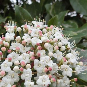 この花はビバーナムティヌスです。 日本に自生するガマズミが落葉樹なのに対しビバーナムティヌスは常緑のためトキワガマズミ(常磐ガマズミ)の和名を持っています。 ピンクの蕾もとてもキュートですが、仄かな香りのする白い花も可愛いです。 秋には光沢のあるコバルトブルーの実を付けます。 東アジア・ヨーロッパの地中海沿岸原産。 レンプクソウ科ガマズミ属の常緑低木。