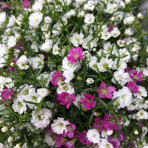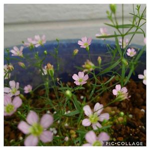 近くのスーパーまでの行き帰りに見かけるカスミ草。 15cmほどの小さい鉢に白とピンクの小花が咲いている。