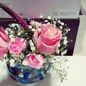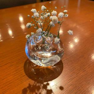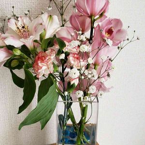 自宅で友人と飲み会なのでいつもよりオシャレに飾って見ました。 ビー玉で茎を固定するから意外と花がずれなくて飾りやすかった。
