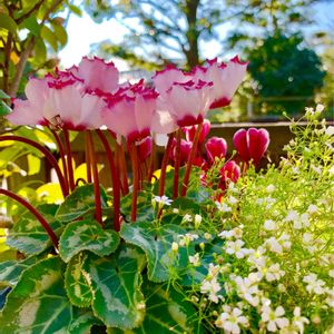 こんにちは☺️ 朝からいい天気です🧡さすがに寒いけど…😨 花たちも太陽をいっぱい浴びてイキイキしてます🎶 シクラメンの淡いピンクが青空に映えて、美しい〜💕
