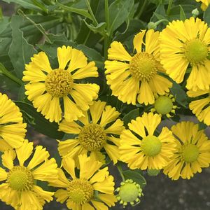 【団子菊】《キク科》 花言葉 「寛容な心」「涙」「上機嫌」 「恋の望み」「絶望の恋」 ヘレニウムの英名Sneeze weed(くしゃみ草)は、ネイティブアメリカンがこの草を嗅ぎタバコにして、くしゃみで悪霊を追い払う儀式に用いていたことにちなみます。 別名 ヘレニウムには、 多くの花言葉があります。 「涙」「絶望の恋」は、 学名の由来になっている古代ギリシャのスパルタ王妃ヘレナにちなみます。 絶世の美女だった彼女に求愛する者が後を絶たず、 数多くの争いごとが起き、 たくさんの犠牲者が出たことを 悲しみ、流した涙のあとに ヘレニウムが咲いたという 言い伝えがあります。 「寛容」「上機嫌」は、 かわいい花姿からつけられたそうです。