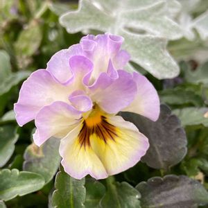 こんにちは フリル咲きビオラ まだまだ朝は マイナスの気温になる中 外に置いている鉢ですが かわいく咲いてます😊 色はお迎えした時より ずっと薄くなりました