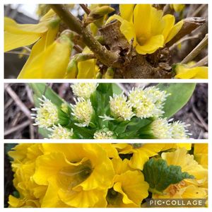 庭に黄色の花が咲いてます✨ 上から レンギョウ・ふきのとう・プリムラ