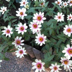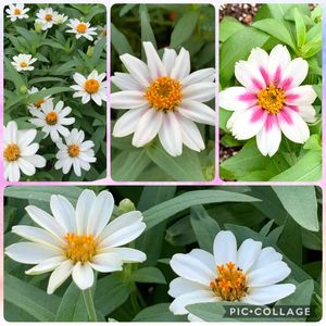 ジニア プロフュージョンチェリーバイカラー 美白のジニア😆 右端が咲き始めた頃 次第に白くなって最近は、ほんのりピンクが残っている程度… 遠目には、普通にシロのジニアになってます😅