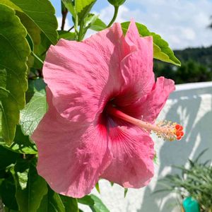 早朝、半分だけ開いたハイビスカス🌺 今頃は満開かな💕 これから大雨予報、耐えてね💦