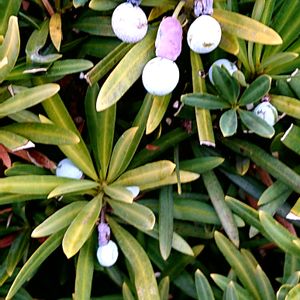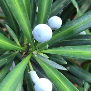 面白い物を見っけ❣️ ニコイチのこれは、何でしょうか?🤔 早速調べてみました😊 「イヌマキ(犬槇)の実」 ブルーベリーのような色の方💜は食べられるらしく、ゼリーのようでほんのり甘いぶどう🍇の味らしいです😋 白い粉を振ったような薄緑の方💚は、種だそうです。 ほんの少し甘いお味のようですが、食べてみる勇気はありません😆