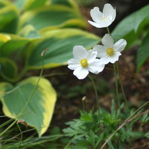 アネモネ シルベストリス ホスタの間から顔を出しました。 小ぶりな白い花は清楚で、リーフにあいますね♡︎ᵎᵎᵎ♡̷︎♡⃜︎♡⃡︎